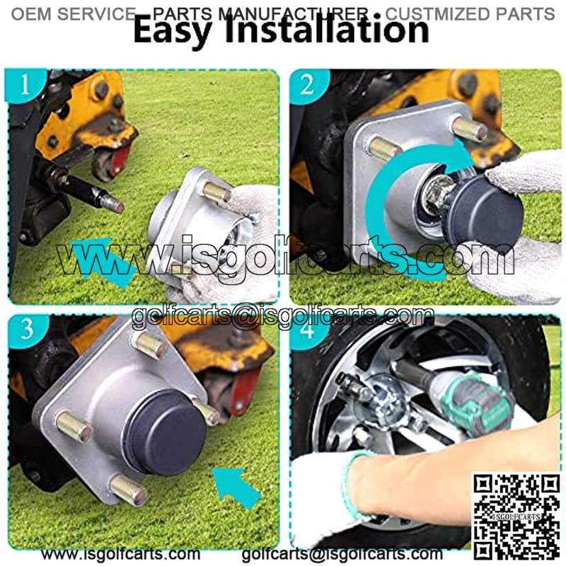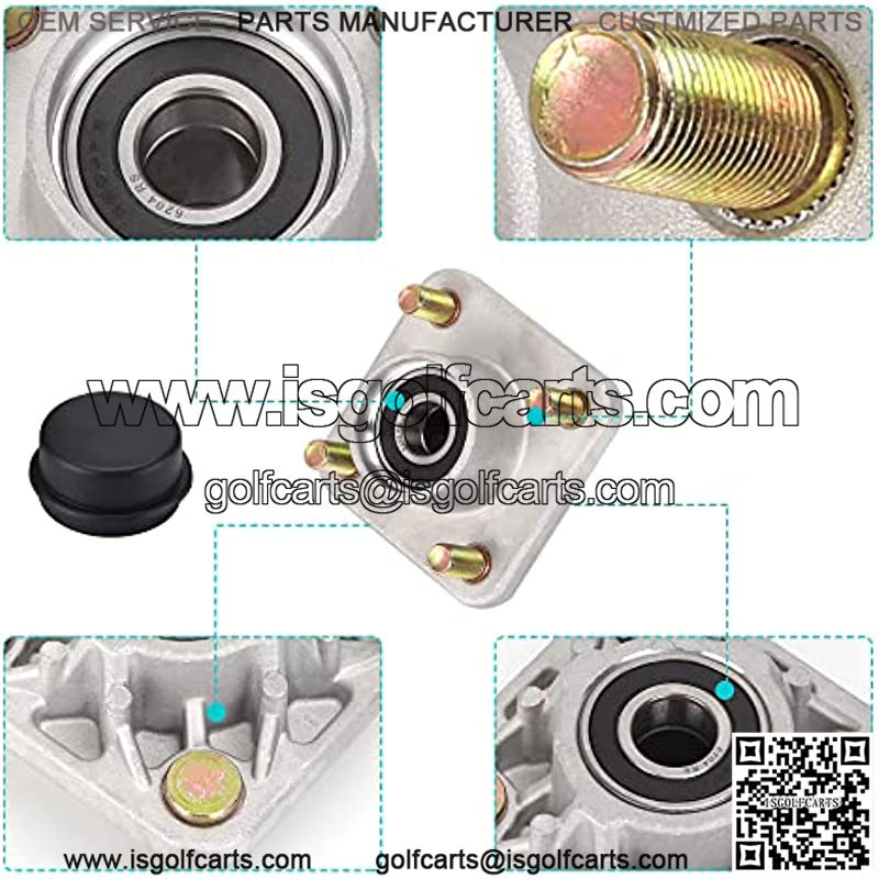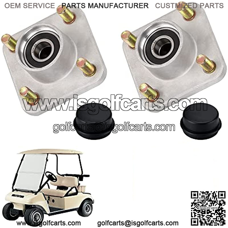 2 Packs of club cart front wheel hub replacement assembly, include aluminum hubs, bearings, races, lug bolts, plastic dust covers. Directly replacement for your damaged or worn out parts.
