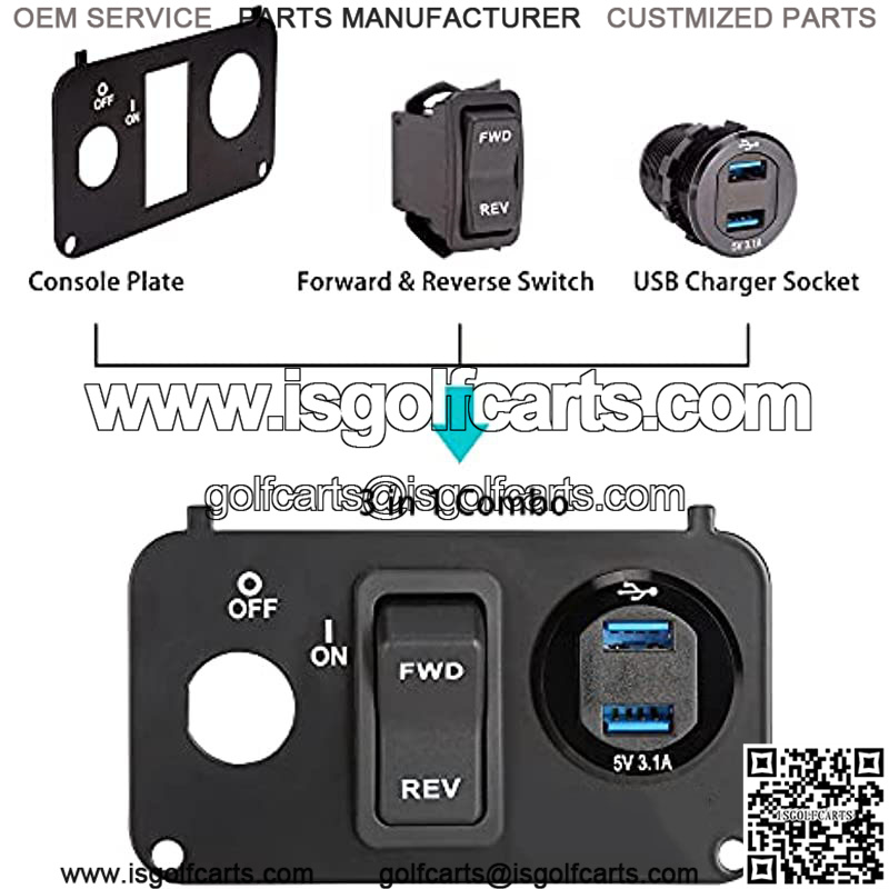 Key switch console plate for EZGO TXT Medalist electric golf cart. OEM Part#: 73030G01 73030G02 73030G05 73030G06. It works for 36V and 48V system. It is a console plate that comes with forward reverse switch(OEM part# 74323G01), USB charger socket with digital volt meter. There’s a hole on the console plate for you to install your stock key switch. Notes: The LED digital voltmeter will also stay on when the switch is off, unless you take the hot wire to the key switch, the volt meter will turn off when the switch is off.