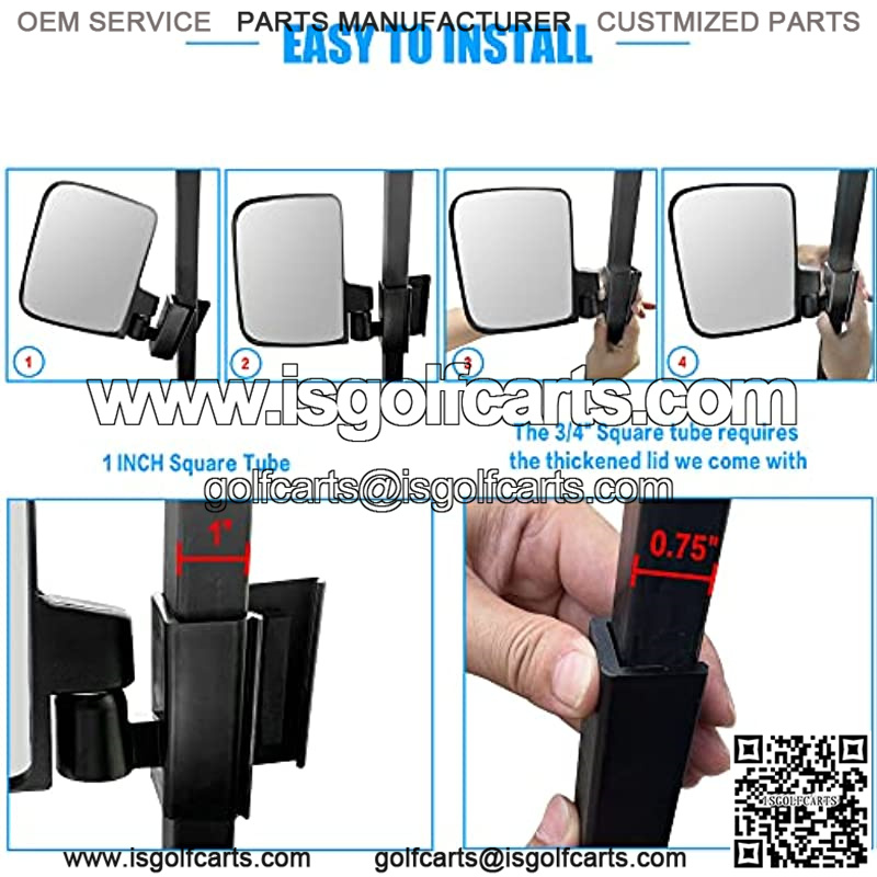 Our drone-free parallel mirrors are suitable for CLUB CAR, YAMAHA, EZGO TXT 2014+ folding windshields and golf CLUB carts with 0.75 and 1 inch square tubes.