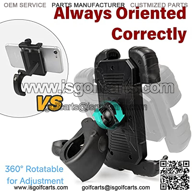 ??VERTICAL OR HORIZONTAL??- Our golf cart phone holder features a 360-degree rotatable head that allows you to orient your phone in vertical or horizontal position, paired with shock-absorbent pads on the back and secured corners that reduce vibration and friction while driving.