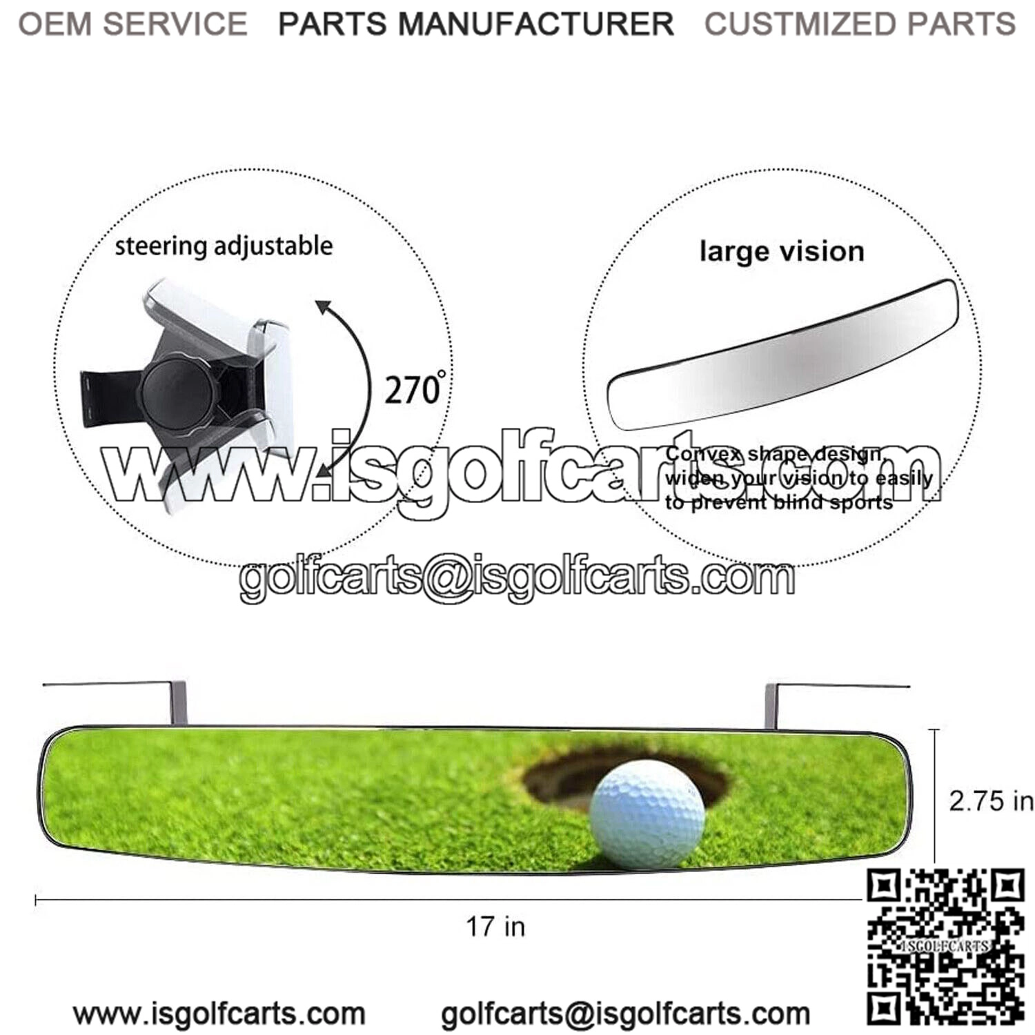 – Golf cart Panoramic Rear View Mirror made of High impact ABS housing with anti-glare mirror and adjustable height and up down viewing, steady and no vibration angle.