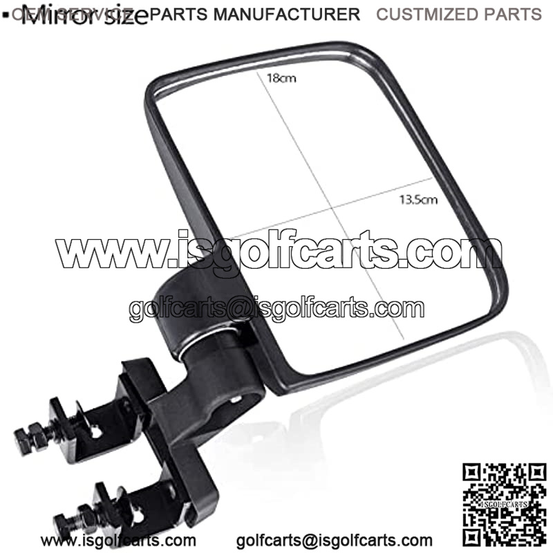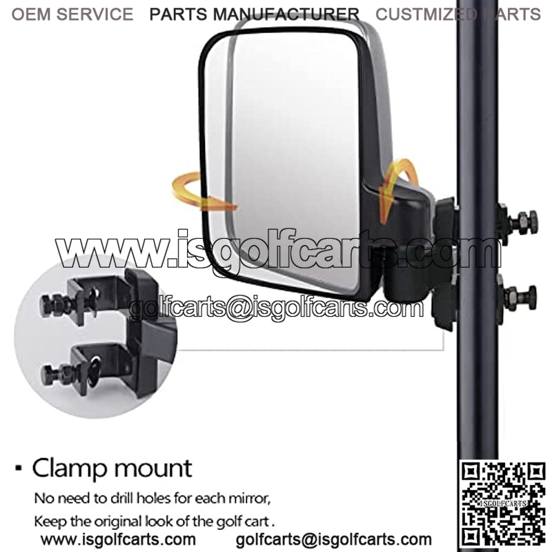 golf cart foldingside mirrors include all hardware for installation. The mirror folds back uponimpact to keep the mirror from breaking, the whole set of mirrors is made ofimpact black PP plastic housing, shatterproof glass, and durable ABS clamps. Itis anti-friction and corrosion-resistant, suitable for all kinds of weatherconditions.Fitment:GolfCart Side Mirrors Compatible with Club Car EZ-GO Yamaha and Others