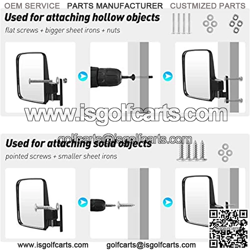 ??EASY INSTALLATION??: The package of Golf Cart Mirrors included One Pair mirrors and 2 sets of mounting tools, which used for hollow objects and solid objects, suitable for most of golf cart.