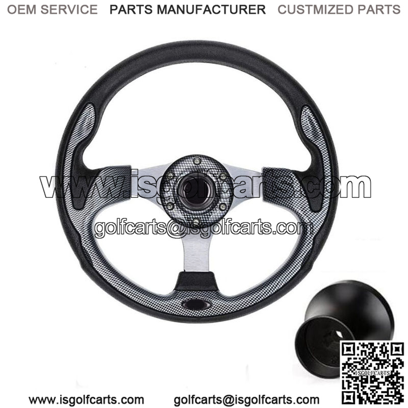 Golf Cart Steering Wheel & Black Hub Adapter 5/6 Hole for Club Car Precedent Carts- 12.5″ Carbon fiber golf cart steering wheel and Black 5/6 hole steering wheel hub adapter fits Club Car Precedent;- The decor of this golf cart steering wheel is inspired by professional racing cars. By replacing this steering wheel with its nice racing style look, your golf cart will look new and stand out on the street.- Golf Cart Steering wheel brings a comfortable feel through the rounded and smooth grip that fits the curve of the human palm, so that your hands do not get tired of driving for a long time.- Golf Cart Steering wheel has hard aluminum spokes and Lightweight body made of PVC, wear-resistant, corrosion-resistant and 1-year warranty, which makes it last longer.- Easy to install: Come with upgraded nuts and wrench for 5 minutes quick installing this golf cart steering wheel and Club Car Precedent black hub adapter. – Package: 1x Golf Cart Steering Wheel + 1 x 5/6 hole Steering Wheel Hub Adapter for Club Car Precedent.