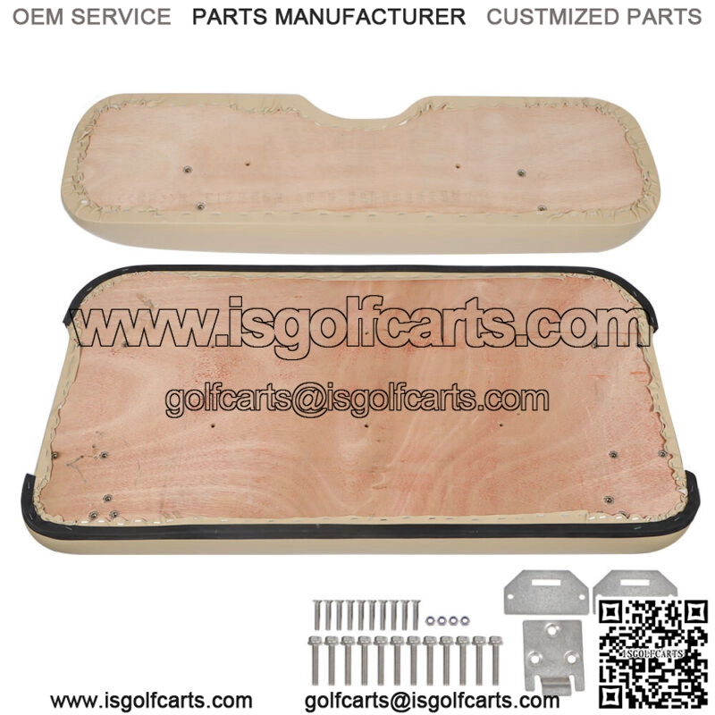 Replacement front Seat Lean Back and Bottom Cushions For EZGO Medalist TXT 1994-2013 Golf Cart Specifications: 1x Tan Front Seat Lean Back Cushion (One Piece)1x Tan Front Seat Bottom CushionIncluding Seat Cover, Molded PU cushion, Wood Base Including mounting hardware and seat hingesNo Lean Back Plastic Cover, no hip restraintsPredrilled holes matching seats.The seat cover is made from PU