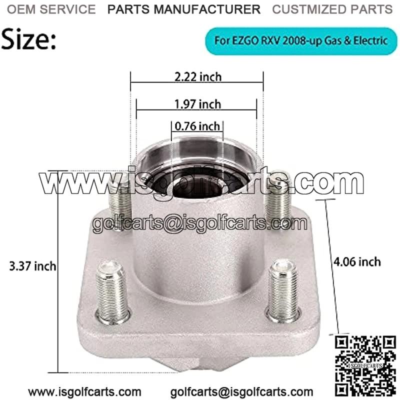 4 Bolt aluminum front wheel hub assembly, set of 2 Fits EZGO RXV 2008-up gas and electric golf cart Replaces OEM Number(s): 609603 600001 Includes: aluminum hub(602340), ball bearing(602341), tube bearing spacer (602342), spindle plastic dust caps(12091G2) Directly replaces your worn out or damaged front wheel hubUpgrade Light Kit 48V Battery Charger Front Basket Hip Restraint Hip Restraint Foldable Windshield Fit Models EZGO RXV G&EEZGO RXV 2008-up ElectricEZGO RXV G&EEZGO RXV 2008-2015 G&EEZGO RXV 2016-up G&EEZGO RXV G&EIgnition Keys Seat Hinge Windshield Clips