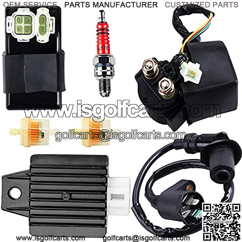 Package Includes:1 X Ignition Coil ,1 X CDI 4+2 Pin, 1 X Voltage Regulator,1 X Solenoid Relay, 1 X Spark plug ,(give away Fuel Filters 2Pcs)