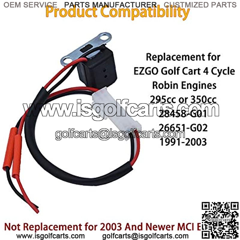 Part Type: Pulsar Coil.Replacement for EZGO Golf Cart Robin Engines 4 Cycle 295cc or 350cc (Pre-Mci models only) 1991-2003.Replacement for part number: 28458-G01 26651-G02.Special Notes: This coil will not Replacement for the EZGO Workhorse ST 480, the ST 4 x 4, the Cushman 4800 Commander, or 2003 and newer MCI Engines.Package includes: 1x Ignition Coil & 1x Harness & 2x Connecting Glue.Please ensure this is the correct part for your engine before ordering.
