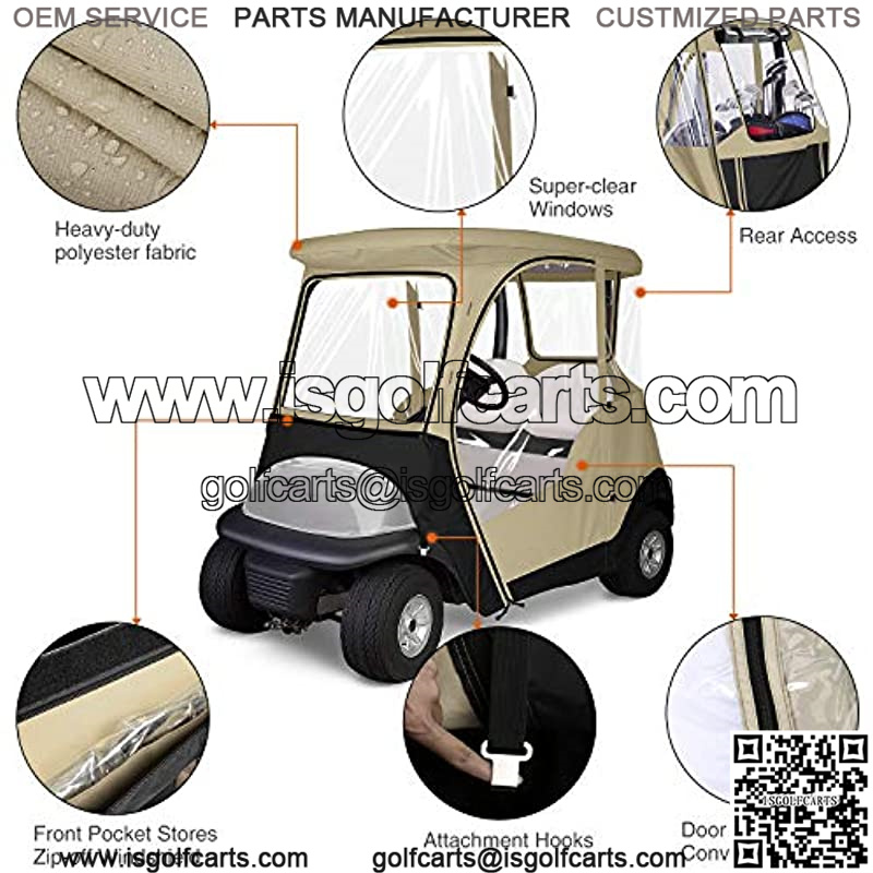 2 PASSENGER GOLF CART ENCLOSURES Custom fits Club Car Precedent 2000-2019. Cover roof dimensions 61″L x 40″W (rear) x 33″W (front) , and the side height is 57.5″. Please kindly check the size and model before your purchase. SUPER-CLEAR PVC WINDOWS & FULL PROTECTION Clear transparent windows provide maximum visibility. The rest is made of 800D Oxford polyester with PU coating(while others are fragile 420D fabric), extra durable, more waterproof, tear resistant and anti-UV, effectively protects your golf cart from the rain, wind and other weather conditions. ROLL-UP WINDSHIELD/ DOORS/ REAR PANEL 1) The windshiel has a zipper so you can unzip and store it in the front pocket; 2) The doors can be zippered both inside and outside. Also, every door side has 3 square buckles and magic tapes to secure it when rolled up. 3)The rear panel is easily zipped off to access to your golf clubs. HEAVY-DUTY ZIPPERS & CLIPS 1) The upgraded 10# zipper is wider and firmer than others (just 8# zipper), providing a smooth pulling. 2) The zipper head with cord design make it more convenient for you to zip. 3) 4 Velcros of the sides to strongly connect the different parts of the cover. 4) 8 solid bungee cords with hooks on the bottom, hold it tightly to your golf cart, maximum wind resistant. EASY INSTALLATION & TAKE IT EVERYWHERE Assembly in minutes, no tools needed. Come with a comfortable seat cover and carrying bag, convenient to take it everywhere. PS: 3 Years Warranty, if you have any issues, just feel free to tell us.