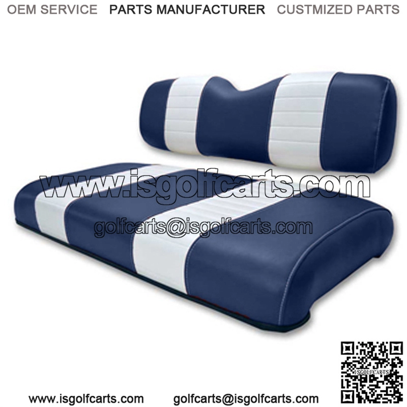 Dress up the look of your golf cart today, with this two-tone replacement seat cushion set! Each set includes the complete seat assembly: foam, plywood, and a vinyl cover.Specifications:Fits 1979-1999Navy with white center stripesMade from high-quality marine grade vinylThree-piece set (includes seat bottom and two individual backrests)Simply remove seat handles and seat hinges from your old seat bottom and re-attach to new seat