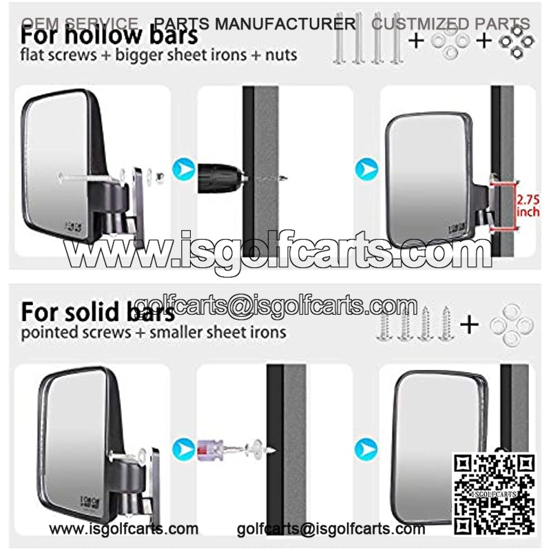 Golf Cart Side Mirror: Pair (1) folding side view mirrors in box, 2 bolt universal mount, 5″X 7″ Fold in fully adjustable, designed to be a simple installation into the side of your roof supports. You choose the height and viewing angle.