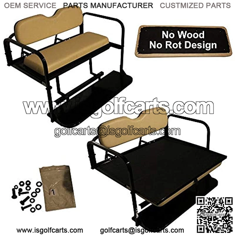 This seat kit makes a great addition to any golf cart converting your 2 passenger golf cart in to a 4 passenger golf cart. This seat kit includes the Flip Folding capability which allows the bottom seat cushion to flip over and converts the 4 passenger golf cart in to a very strong utility cargo bed featuring our HD Poly Deck for ultimate strength and versatility measuring 42W X 36D. We also include a grab strap to assist when flipping the seat from the closed 4 passenger design over to the cargo bed design. Seat Cushions: All seat cushions are marine grade and are factory matched colors. The back of the seat cushions have a polypropy