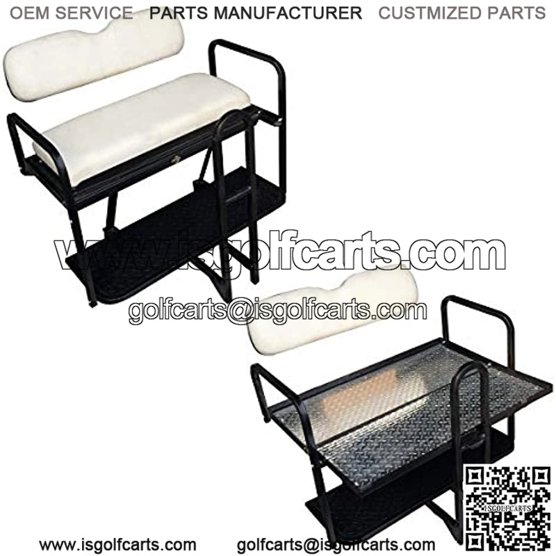FREE SAFETY GRAB BAR! Bolt On Design 3.5″ Thick Seat Bottom Cushion is much thicker than our nearest competitors equal seat, Heavy Duty Gloss Black Finish to Resist Fading, Highly Polished Diamond Plate Cargo Deck Area, Includes everything needed for installation. Your existing factory roof supports would be re-used with this seat kit and your plastic sweater basket will remain in place, 360 Degree Rail 1″ Tall ALL the way around to hold cargo in place and for added strength of the flip deck. This rear seat fits Club Car Precedent we include everything needed for an eas
