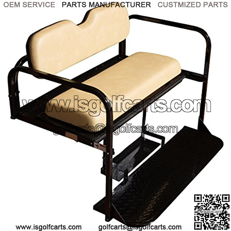 This seat kit makes a great addition to any golf cart converting your 2 passenger golf cart in to a 4 passenger golf cart. This seat kit includes the Flip Folding capability which allows the bottom seat cushion to flip over and converts the 4 passenger golf cart in to a very strong utility cargo bed featuring our HD Poly Deck for ultimate strength and versatility measuring 42W X 36D. We also include a grab strap to assist when flipping the seat from the closed 4 passenger design over to the cargo bed design. Seat Cushions: All seat cushions are marine grade and are factory matched colors. The back of the seat cushions have a polypropylene backing with pre tapped bolt holes for the seat cushions to mount to. Also with the NO Rot, NO Wood design and the use of polypropylene seat backing you no longer have rotting wood on the backs of the seat in a few years. Installation Details: This items will require 1.5 to 2 hours to complete the installation, however we do include very nice FULL COLOR installation instructions that are clearly labeled. All mounting hardware, bolts, and supports are included, this will make for an easier stress free installation – With this seat kit you will remove your factory basket behind the seat along with all of the brackets that connect the seat to the golf cart. This kit will replace the removed brackets and this kit will include new rear roof supports. – Technical support is always available by phone or email ready to answer any questions. – Estimated Installation Time is 1.5 to 2 Hours