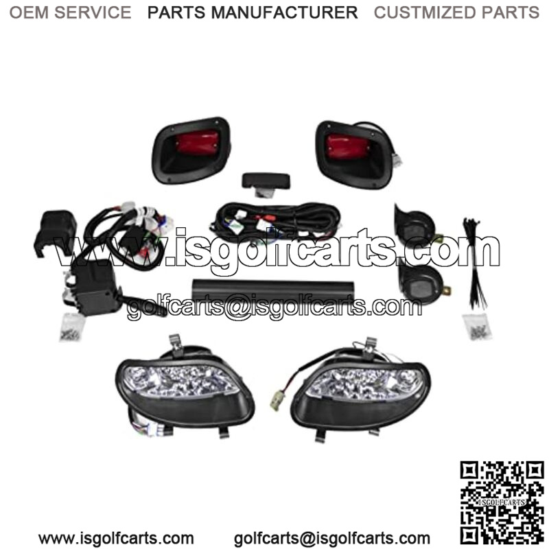 Features: Fits EZGO TXT, T48, Valor, and Freedom (2014-Up) Gas & Electric Models Includes Street Legal Deluxe Upgrade Kit with Turn Signals, Hazard Lights, Brake Pad, and Horn Clip-Style Headlights for Easy Installation No-Flicker, Wide-Range LED lamps provide Green Energy with 10,000+ Operating Hours Expected Full Plug-N-Play Easy to Install Wiring Harness Injection Molded Black Plastic Housing High Quality Mounting Hardware for Long Lasting Durability In Line Fuse for Added Protection Headlight Lumen Rating: 1200 Total Operating Watts: 2.8 Expected Operating Hours: 10,000+ Kit Includes: LED Headlights with 3-Pin Connectors and High/Low Beam Functionality LED Tail Lights with 3-Pin Connectors Steering Column Cover (Measures 13.5 x 1.5) Turn Signal Switch Assembly (with Hazard Flashers and Power Functionality) Push/Pull Switch for Hazard Lights Horns for 12-Volt and 48-Volt Applications Brake Pad with Functional Brake Lights Full Plug-N-Play Easy to Install Wiring Harness Installation Hardware Full Installation Instructions (Cutting Templates Included) Tech Tips: Light Kit Operates at 12 Volts Only, ONLY Connect to a 12 Volt Power Source Voltage Converter/Reducer Highly Recommended on 36- and 48- Volt Applications Please refer to your local municipality regulations for additional street-legal requirements