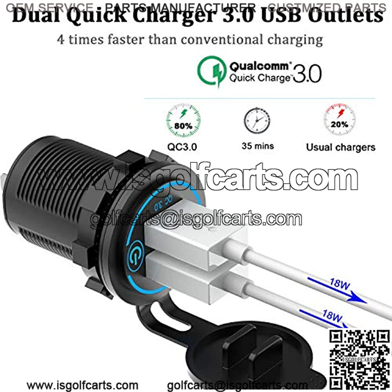 ??Quick Charge 3.0 USB Outlets??Qidoe Dual QC 3.0 Car Sockets total power up to 36W. It can charge two devices simultaneously at QC3.0 speed from 0 to 80% in 35 minutes. Provides 4x faster charging speed to compatible devices. ??ON/OFF Touch Switch??Designed with touch-sensitive on/off switches for power control to effectively prevent power outflow, save energy and extend the life of product and equipment. Also, the blue led lights makes it easy to find in a dark environment and allow people to check if the connection is successful. ??Wide Compatibility?? Fits for 12-24V car, boat, marine, motorcycle, ATV, RV etc. This 12V/24V power outlet is suitable for charging iPhone 12, iPad, AirPods, Samsung, Pixel 5, Moto, LG, ZTE, HTC, BLU, tablets, power banks, sports watch, switch, dashcam etc.( ???? NOTE: iPhone series does not support fast charging, charging the iPhone is normal speed.) ??Super high quality??Adopted PA66 environment-friendly nylon material, high temperature resistant, low temperature resistant, also has anti-flame-retardant properties, makes it a high safety standard product. Certified by CE & ROHS with Over-load, Over-current and Short Circuit Protection to ensure charging safety, guard the safety of your devices. ??Easy Installation??Qidoe 12V USB car sockets easy to be installed. “+” to positive pole, “-” to negative pole. Package include: 1 x Brand new QC 3.0 USB charger socket, 1 x 23.6 Inches Wire, 1 x 10A fuse, 60-Day refund, 5-year Replacement and Lifetime Support.