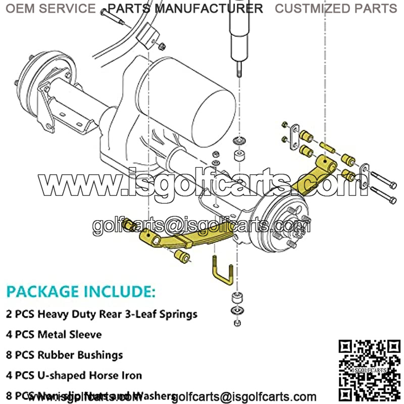 The leaf spring bushings kit for EZGO TXT includes: Includes (8) Rubber (Not Imitation) Bushings & (4) Stainless Sleeves, (2)Heavy Duty Rear 3-Leaf Springs, 4 U-shaped horse iron.