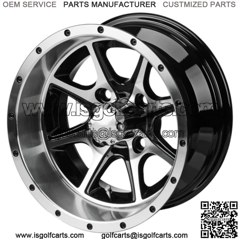 12″ Azusa Black & Machined Golf Cart Wheel Center Cap included Wheel Dimensions: 12X7 with 4×4 bolt pattern and 3+4 offset Lug Nuts sold separately