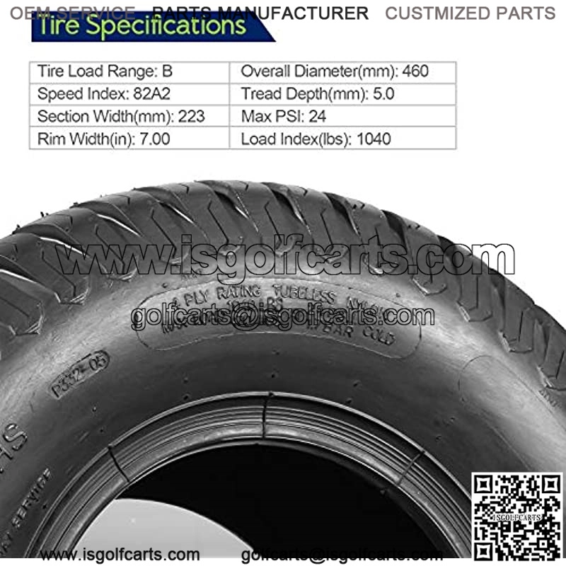 15×6-6: Tread Depth: 0.23″/6mm, Rim Width: 4.5″, SW: 6.29″/160mm, OD: 14.45″/367mm, Max. Load: 570 lbs@30 psi. 18×9.50-8: Tread depth: 5 mm, Rim Width: 7 ??, MaxLoad 1040lb/24psi, Load/Speed Index.82A2. Multipurpose turf friendly design for lawn & garden utility vehicles or golf carts. Wide shoulders design for maximum traction and weight disbursement. Heavy duty 4 ply tubeless tire, tires only, rims are not included. We ship your orders depending on their weight, when you make a single purchase of two or more tires, these tires will be packed in multiple packages which may not arrive at their destination at the same time.