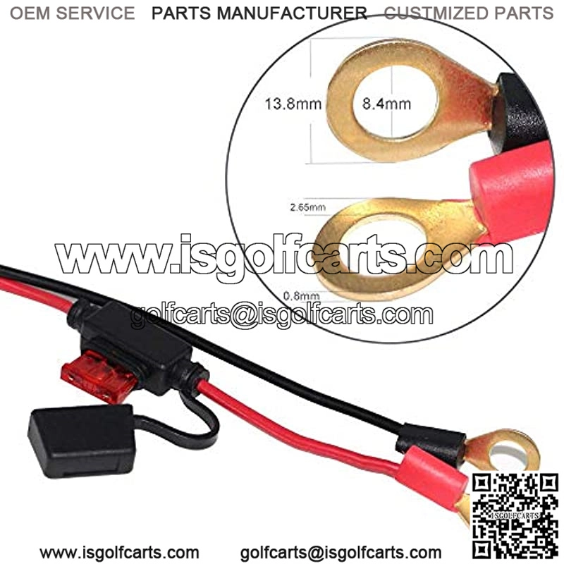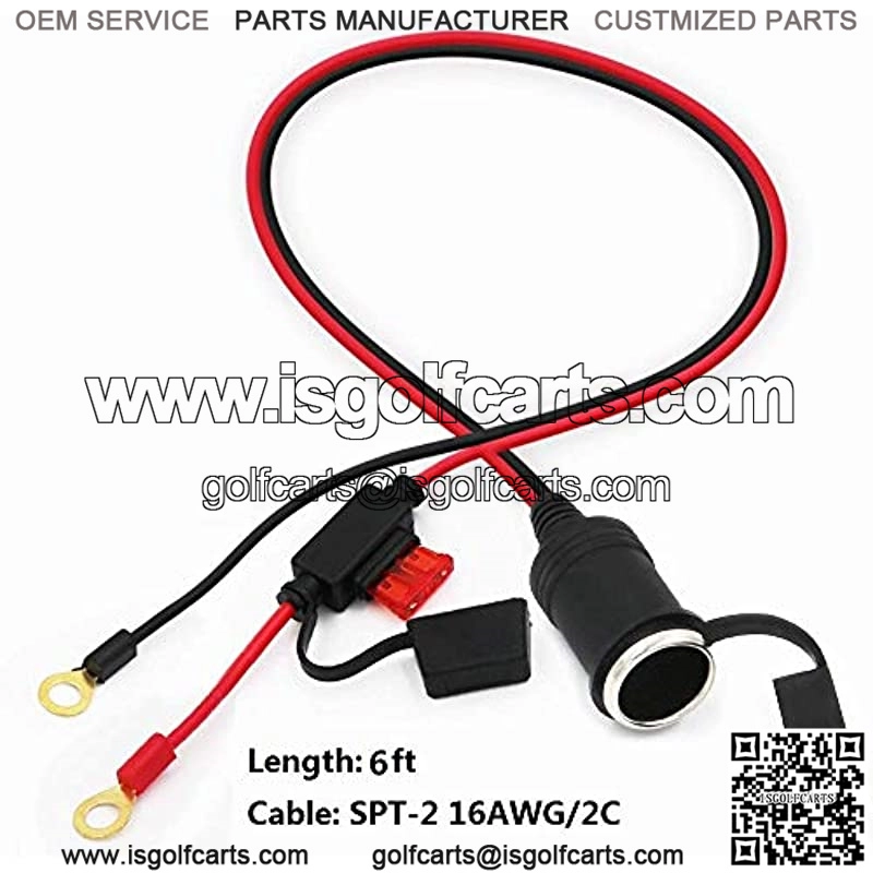 Cigarette Lighter Female Socket Plug to “O” ring terminal style. The size of the hole in the ring terminal: 0.32in/8.3mm. Cable: UL SPT-2 16AWG/2C; Length: 6FT??72????. With Fuse case: 15A for safety. 12V solid socket has a nice rubber cap which keeps out dirt and water. With standard ring terminal connector, appropriate for you wiring directly to 12v deep cycle batteries. Powering for tire inflator, power inverter, radio, fridge, fan, dash cam, air compressors and other 12v accessories Widely use in Golf Cart, motorcycle, boat, lawn tractors, travel trailer, bike, pickup, RV, truck, sprayer, snowmobile, ATV 30day return and exchange for free. If there is any ideas, PLS feel free to contact us, we will response it within 24hours, and actively solve problems for you until you are satisfied.