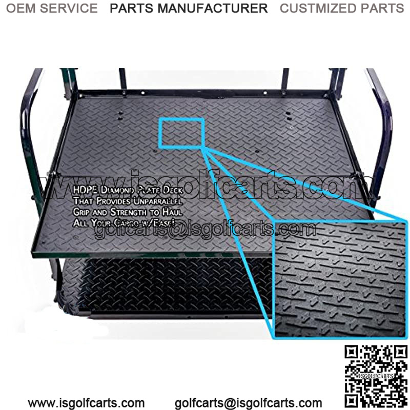 Flat satin, black powder coat framing finish with UV additive, resisting fading High Strength molded polyethylene cargo bed with diamond plate texture Standardized hardware – One size wrench installation (10mm) Black coated rust-resistant hardware Detailed full color instructions