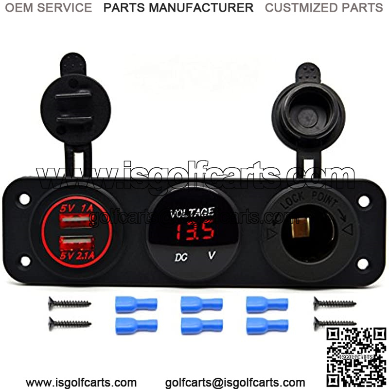 Package includes: 1x Cigarette Lighter Socket + 1x Red LED Voltmeter + 1x Red Dual USB Charger + 6 x Insulated Terminals + 4 x Screws