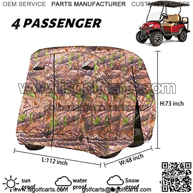 Wide compatibility — Cover size: 112 inches L x 48 inches W x 73 inches H, suitable for most golf carts with extended 80″ L roofs, 2 rear seats, armrests and footrest. Our Golf cart cover 4 passenger is very easy to use, you can just use it by yourself. This Golf cart cover can be used for ezgo golf cart / club car golf cart / yamaha golf cart.