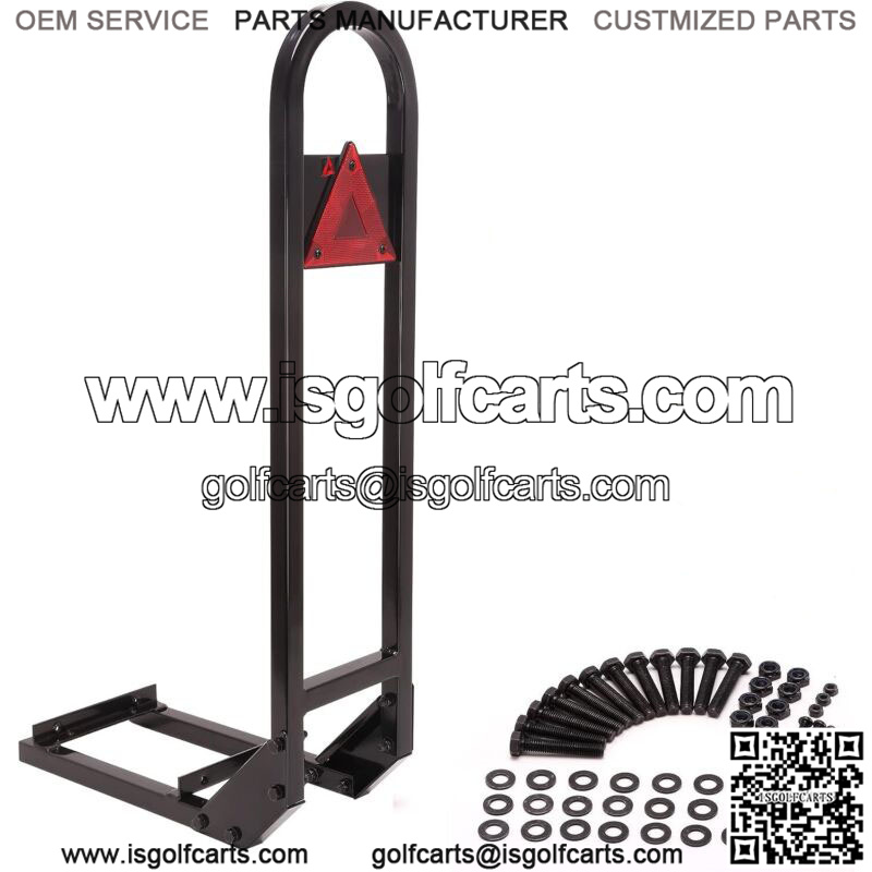 Golf Cart Rear Seat Safety Grab Bar for EZGO Club Car Yamaha with Safety Triangles Red Directive Design- universal golf cart rear seat safety grab bar fits EZGO, Club Car and Yamaha. Gives added stability when getting on and off the rear seat. A good additional for a golf cart rear seat.-If your family have older parents or younger children, this rear seat grab bar is your best choice. It has added rear seat passengers much safety while getting on and off the rear seat.- U-shape design makes it more convenient for rear seat passengers to get in and off the car and grab while sitting at the rear seat, increases the safety of the passengers.- Golf cart rear seat safety grab bar made with heavy duty metal, high quality welding and smooth black finish. Thicker steel pipe, rear seat armrests and trailer buckles have a strong carrying capacity and impact strength. Black protective powder coat preventing rust and corrosion, looks glossy. Makes the passengers feel much more safer at the back seat.- Some easy modifications can be made if your foot board is longer(drilling, washer, etc). Mounts fully underneath footstep for more secure design, seat can fold down and has enough room without hitting the bar. The distance between the brackets front to rear is between 10 5/8 and 11 inches (there are slotted holes). Easy getting on and off the golf cart.
