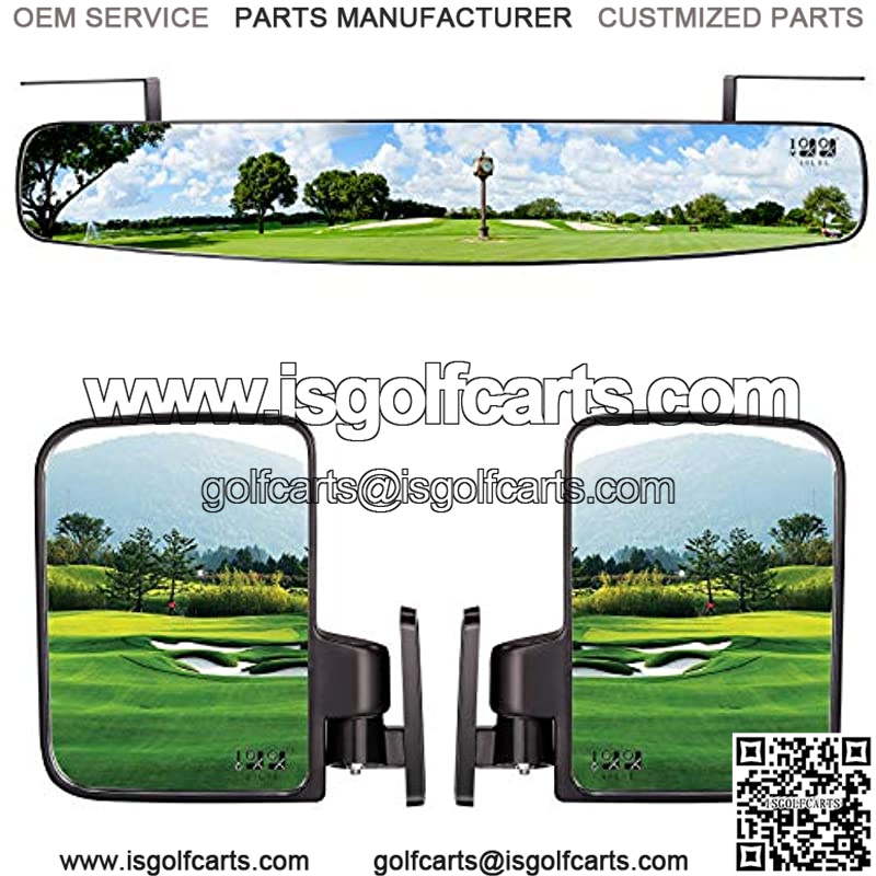 Fit: for EZ Go, Club Car, Yamaha. Package Include: You will receive 1 Side Mirror & 1 Rear View Mirror. Product Include:2.75″ x 16.5″ mirror face 16.5″ Extra Wide Panoramic Golf Cart Rear view Mirror; 5.5″X 7″ Fold in fully adjustable 2 pair folding side view mirrors in box More Safety: Golf cart universal side mirrors-real glass lens of the mirror, give you non-distorted and ultra clear images, helping to reduce blind spots and ensure your driving safety. High Quality: Made of Impact resistant high strength and light weight molded plastic, folds in to avoid breakage/storage??resists damage for years to come??These mirrors are the absolute highest quality and easiest install on the market. Easy to installed: Designed to be a simple installation into the side of your roof supports with provided self tapping screws. You choose the height and viewing angle. Large clear vision area and no vibration.PLEASE MAKE SURE THAT YOU HAVE A SUITABLE SURFACE TO MOUNT TOO (i.e. metal crossbar).