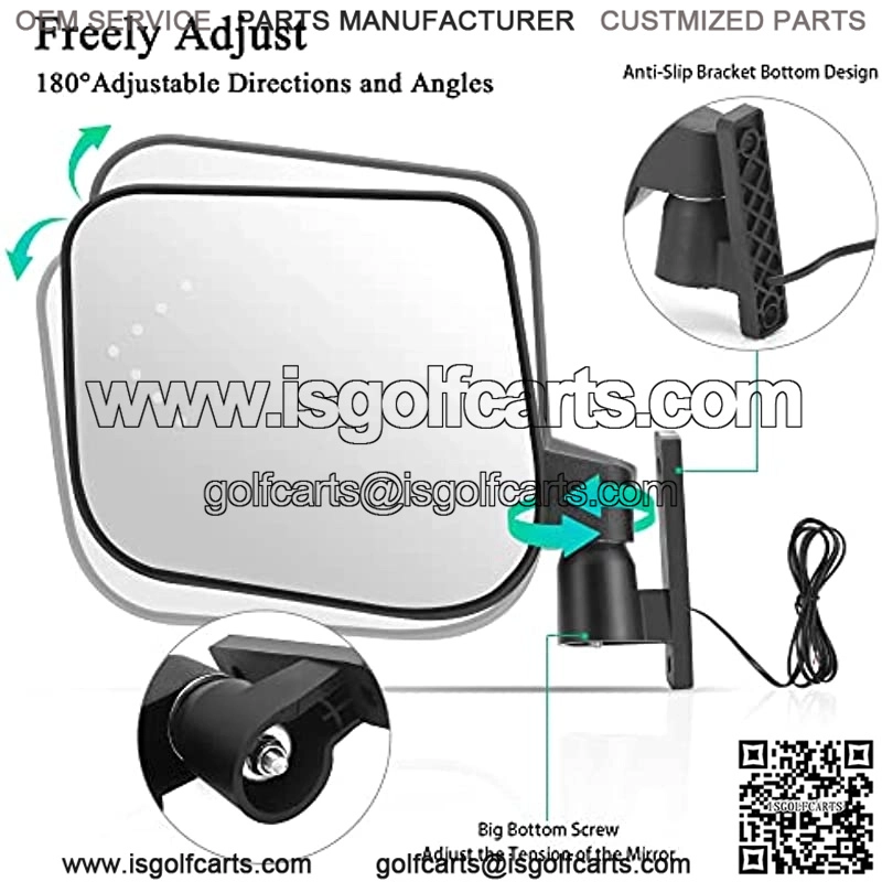 ??SAFER DRIVING??After installing the rear view mirror with turn signal of the golf cart, it has a wider field of vision during the day and a clearer field of vision at night, reducing blind spots. Make your driving safer.??180?? Flexible Adjustment??The golf cart mirror can be easily adjusted up, down, left and right according to your height and field of vision needs.??High Quality Material ??The whole set of mirror is made by qualified PP and ABS materials. Durable and fall-resistant, suitable for all kinds of weather and??Note??Used for blinkers turn signal function. Your cart must be drilled and equipped with headlights in order to attach these mirrors directly to your cart.??Reassuring after-sales service?? If you are not satisfied with the product, please feel free to contact us, we will give you a satisfactory answer within 24 hours.Product Description Universal Golf Cart Side Mirrors for Club Car EZGO Yamaha Golf Carts