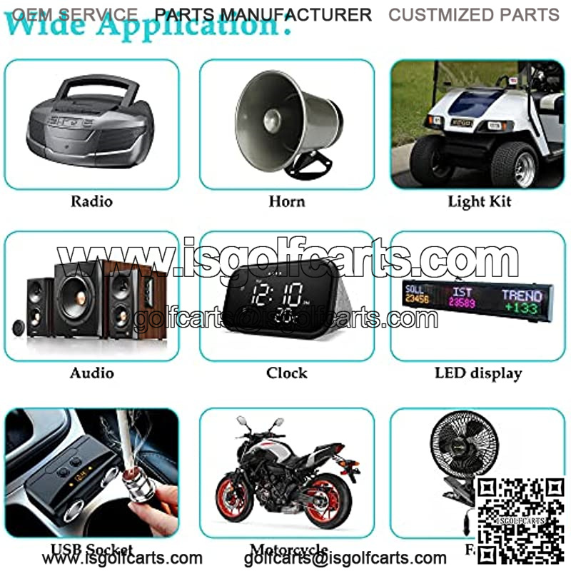 In golf cart, forklifts, bus, large trucks, motor, solar generate electricity, display screen of bus and taxi, car audio device, LED, intercom and monitor system, etc.