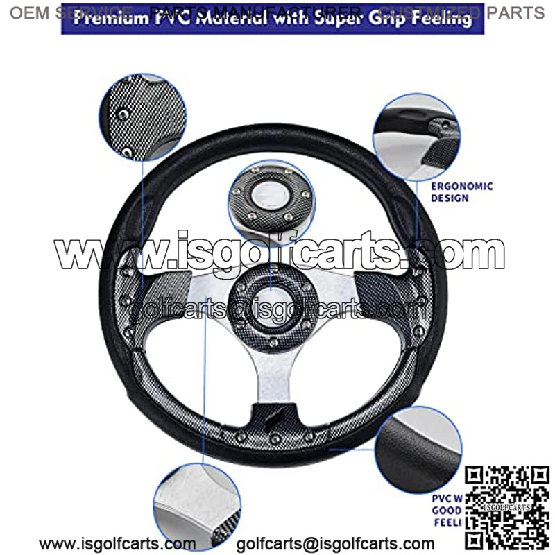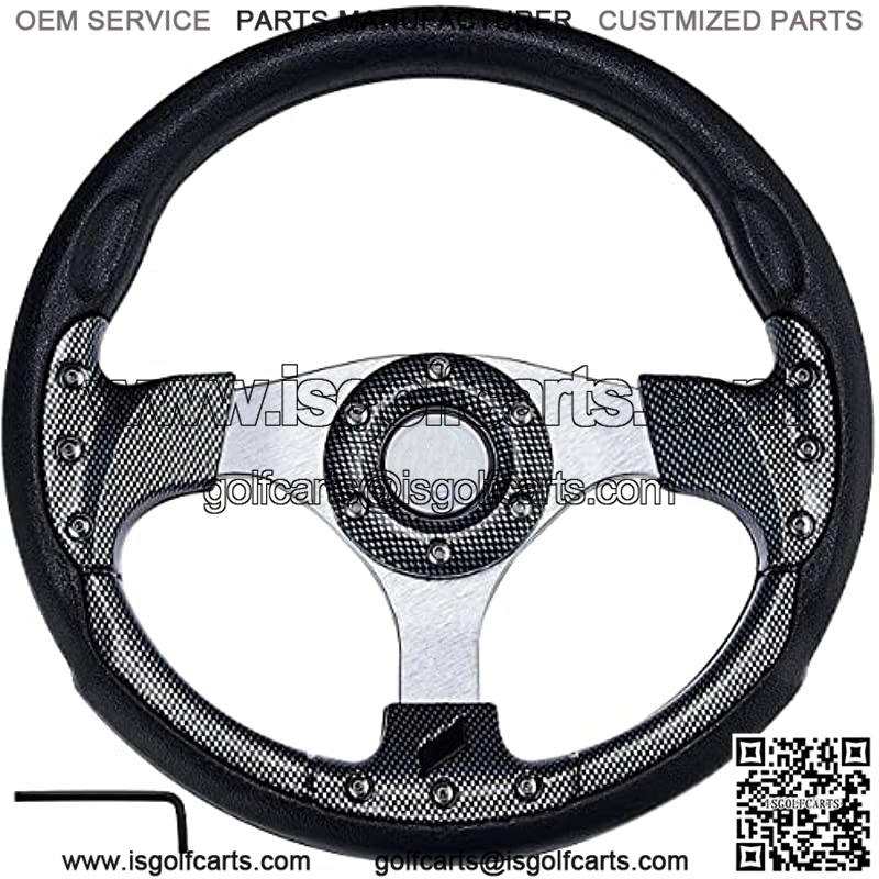 Universal Fit: The steering wheel widely used in many occasions, Fits EZGO TXT RXV, Club Car,Yamaha golf carts and go kart.Premium Materials:High quality aftermarket steering wheel with horn make of premium aluminum and wrapped,comfortable and durable.Easy installation – This racing steering wheel includes a horn and comes with an wrench, easy installation without modification.Attention: The spacing steering wheel must be installed with an Hub Adapter,you should find the 6 bolt pattern hub for your vehicle before purchase. DODOMES steering wheel include 1 x Steering Wheel, 2 x Cable, 1 x Wrench,Installation instructions NOT included.Extreme experience:the flat-bottom steering wheel design provides more space for your legs, making you more comfortable when driving.the specially designed handle is comfortable and supportive.DODOMES GOLF CART STEERING WHEEL FEATURES:Material:Aluminum+LeatherDiameter:12.5″Color: Black/fiber color lookPackage included: 1 x Steering Wheel, 2 x Cable, 1 x Wr