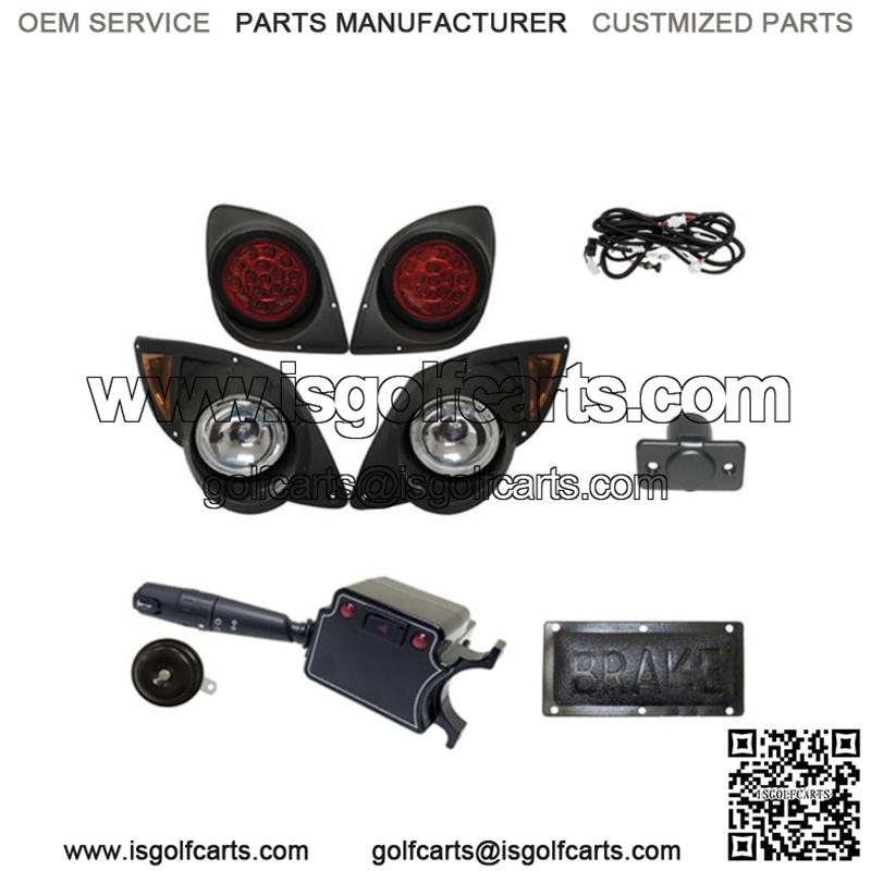 Kit includes: Halogen headlights, LED tail lights, wiring harness, turn signal switch, horn kit, brake light switch, 12V outlet, steering column cover, installation template, and instructions.