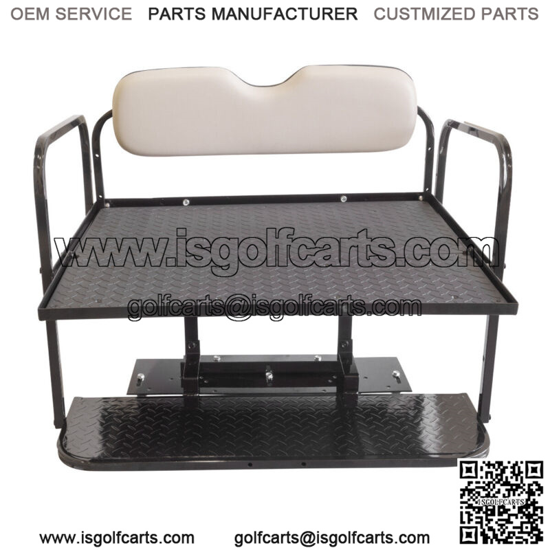 Overview: This seat kit makes a great addition to any golf cart converting your 2 passenger golf cart in to a 4 passenger golf cart. This seat kit includes the Flip Folding capability which allows the bottom seat cushion to flip over and converts the 4 passenger golf cart in to a very strong utility cargo bed featuring our HD Poly Deck for ultimate strength and versatility measuring 42W X 32D. We also include a grab strap to assist when flipping the seat from the closed 4 passenger design over to the cargo bed design. Seat Cushions: All seat cushions are marine grade and are factory matched colors. The back of the seat cushions have a polypropylene backing with pre tapped bolt holes for the seat cushions to mount to. Also with the NO Rot, NO Wood design and the use of polypropylene seat backing you no longer have rotting wood on the backs of the seat in a few years. Installation Details: This items will require 1.5 to 2 hours to complete the installation, however we do include very nice FULL COLOR installation instructions that are clearly labeled. All mounting hardware, bolts, and supports are included, this will make for an easier stress free installation – With this seat kit you will remove your factory basket behind the seat along with all of the brackets that connect the seat to the golf cart. This kit will replace the removed brackets and this kit will include new rear roof supports. – Technical support is always available by phone or email ready to answer any questions. – Estimated Installation Time is 1.5 to 2 Hours