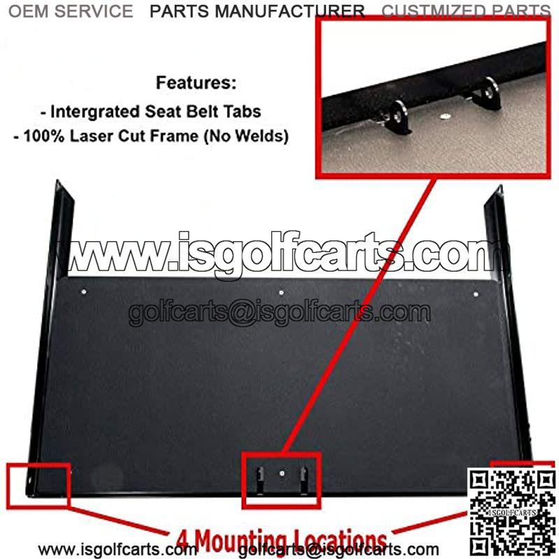 Fits Yamaha G2, G9 Gas/Electric Golf Carts featuring OEM matching Black Cushion Color No Welds and a Single Stamped Foot Plate to Prevent Rusting Integrated Seat Belt Tabs and Cargo Strap Hole Plastic Seat Back with No Wood to Rot – Steel Finished in Textured Powder Coated Black