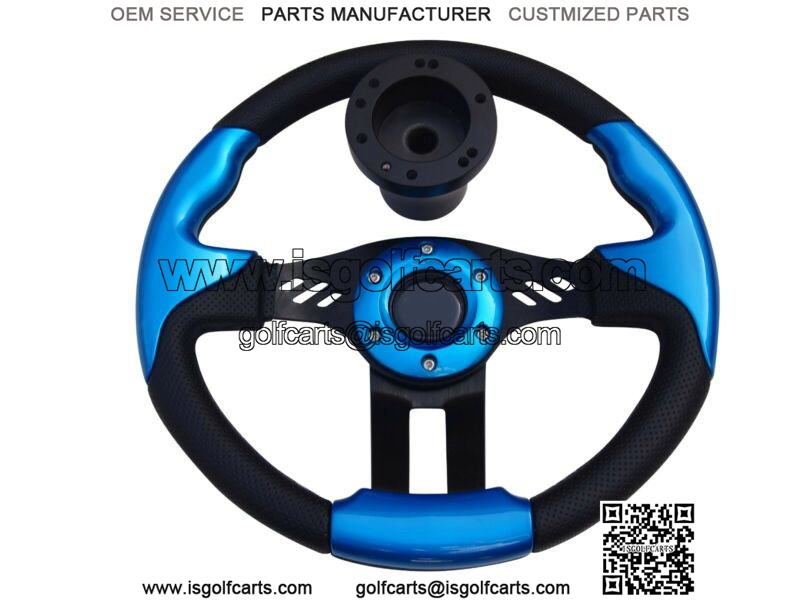 12.5 Inch Blue Black Golf Cart Steering Wheel with Yamaha Golf Cart Hub AdapterFeatures: Customize and add style to your cart. Stylish Blue Black Colors It has a polyurethane grip with extra urethane coating for better heat resistance and longer life. Stylish brushed aluminum center (black coated) Horn button is just for aesthetic purpose only. 12.5 Inch Inch Diameter.Easy installation, Instructions are included.Will work on Yamaha G-series, G29 Drive, Drive 2 Gas / Electric Golf Cart. Will Not work on other Golf Cart Models.We Carry Chrome and Black Hub Adapter. If you would like a Chrome hub adapter, please message us.We ship within 1 busineday from Southern Indiana.