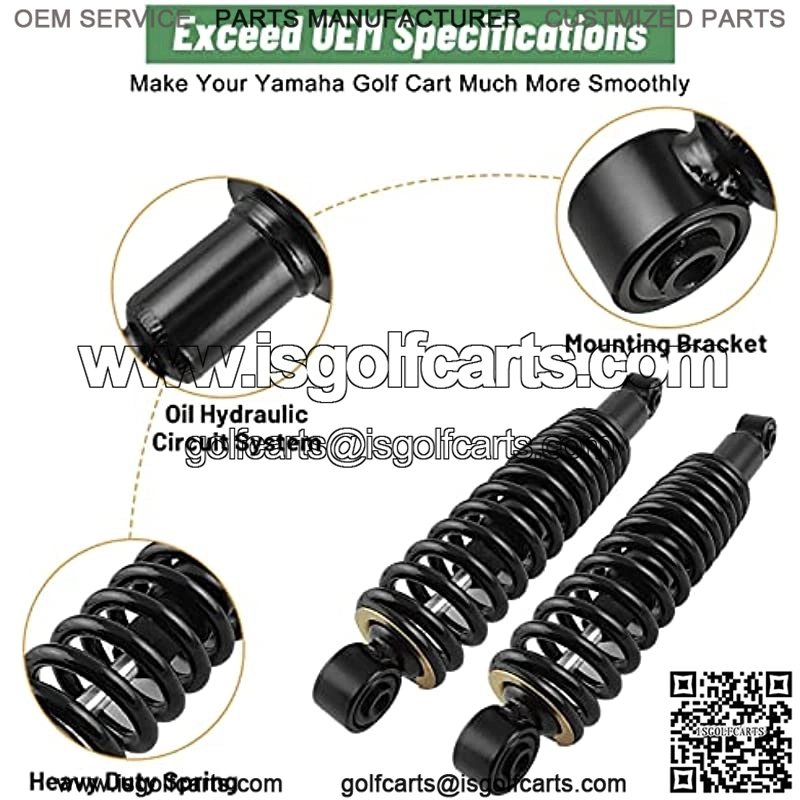 ??Universal Fit??Yamaha shocks rear for gas and electric 1995-up G16, G19, G22 and G29 golf carts. OEM numbers: JN4-f2210-00-00, JN3-f2210-00.??Havy Duty Coil Shocks??Yamaha golf cart heavy duty shocks rear gives you a much more smoother ride with the added weight of passengers, cargo or aftermarket accessories.??Smoother Ride??Those yamaha shocks rear absorbers have good buffering effect which can effectively filter the impact from the outside of the vehicle.??Longer Service Life??Yamaha shocks rear steel rod is micro-polished with double chrome plate. The surface is treated with fine grinding to avoid acid rain corrosion to aviod oil leakage under dynamic load.??Package??2 pcs yamaha heavy duty rear shock absorber. if you have any questions, please feel free to consult online at any time. 100% customer satisfaction and 1 year warranty.is a professional manufacturer and exporter of golf cart parts and accessories for over 10 year. We could offer all kinds of golf cart accessories mainly in